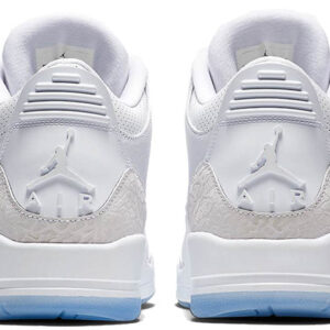 The Air Jordan 3 Retro Triple-White is a sleek and stylish take on a classic sneaker. This shoe features an all-white leather upper with tonal elephant print details, giving it a simple and sophisticated look. With its translucent blue outsole, this shoe is perfect for any occasion.
