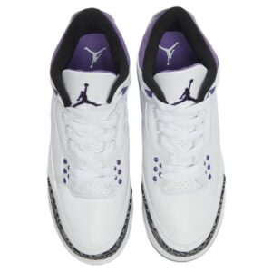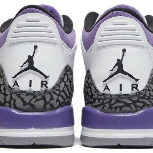 The Air Jordan 3 Retro Dark Iris is a stylish, high-top sneaker from the iconic Air Jordan collection. It pairs a white leather base with bold purple accents around the heel and ankle for an eye-catching look. A black interior and elephant print overlay enhances the bold shape, plus a comfortable white midsole and Cement Grey outsole complete this memorable design. Wear these sneakers for a modern outfit with maximum style; featuring the Jumpman logo on the tongue and heel, plus the ‘AIR’ logo below, this shoe instantly makes any look stand out.