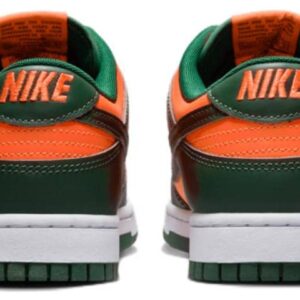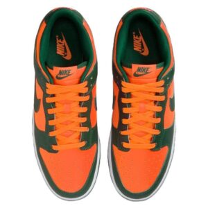 Introducing the Nike Dunk Low Retro Miami Hurricanes. This is a carefully crafted silhouette, stylishly combining Total Orange leather with contrasting overlays in Gorge Green for a two-tone palette inspired by the signature Miami Hurricanes. Lending purpose to the aesthetic, the design features a padded, low-cut collar for increased comfort and movability. The signature Swoosh and branding on the heel tab appear in embroidered orange lettering, while a cupsole provides stability on every step. Finished off with white sidewalls and a cushioned foam wedge supported by a green rubber outsole, this unique design is sure to turn heads no matter where you are.